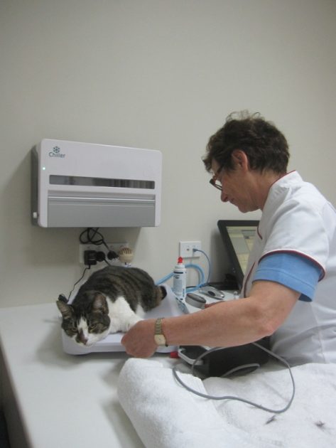 Tiny has a heart murmur and kidney problems. Heart disease often lowers the blood pressure but kidney failure increases it. Fortunately Dr Kate found that Tiger’s blood pressure is quite normal.